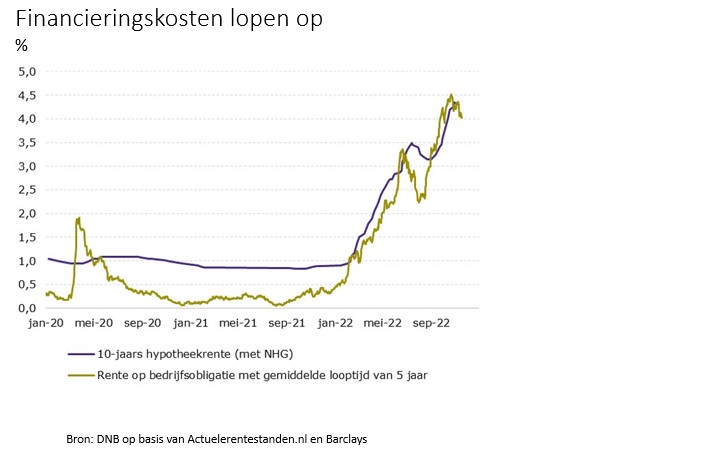 De effecten van de monetaire verkrappingen zijn zichtbaar in sterk gestegen kapitaalmarkt- en hypotheekrentes. Dit leidt tot hogere financieringskosten voor huishoudens en bedrijven.