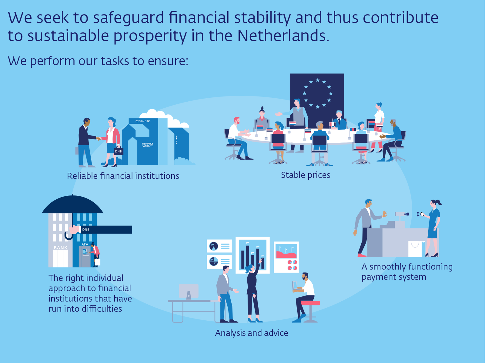 De Nederlandsche Bank seeks to safeguard financial stability and thus contributes to sustainable prosperity in the Netherlands. That is our mission. And our strategy sets out how we intend to achieve it. DNB seeks to safeguard financial stability and thus contributes to sustainable prosperity in the Netherlands. We perform our tasks to ensure: Reliable financial institutions Stable prices The right approach to a financial institution that has run into difficulties Analysis and advice A smoothly functioning payment system