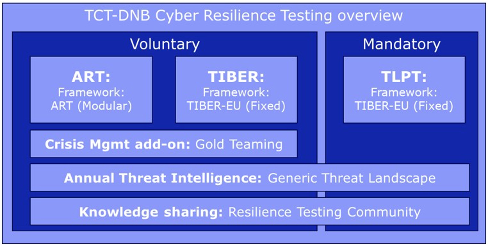 Wanneer een financiële instelling niet valt onder de verplichtingscriteria onder de DORA-verordening, kan zij toch de wens hebben om hun cyberweerbaarheidstesten tegen de wettelijke vereisten vanuit DORA uit te voeren. De inhoud en aanpak van de test is in dat geval identiek aan een TLPT, maar deelname aan deze test is vrijwillig. TCT-DNB hanteert voor zo’n TIBER-test het TIBER-EU-raamwerk. Lees meer over TIBER
